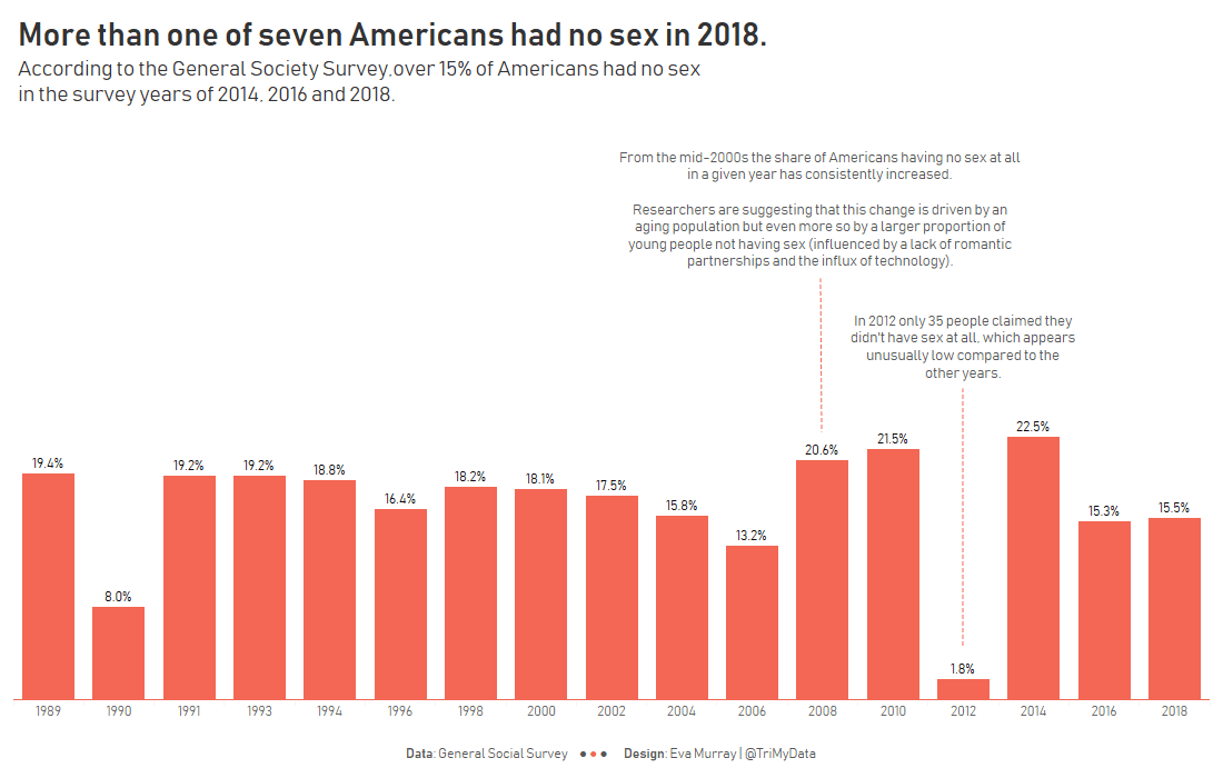 - Without additional data regarding gender and age, I couldn’t find all that much interesting stuff in this dataset, except that people seemed to have more sex in 2012 with a record low of 35 of them responding that they didn’t have any sex that year.