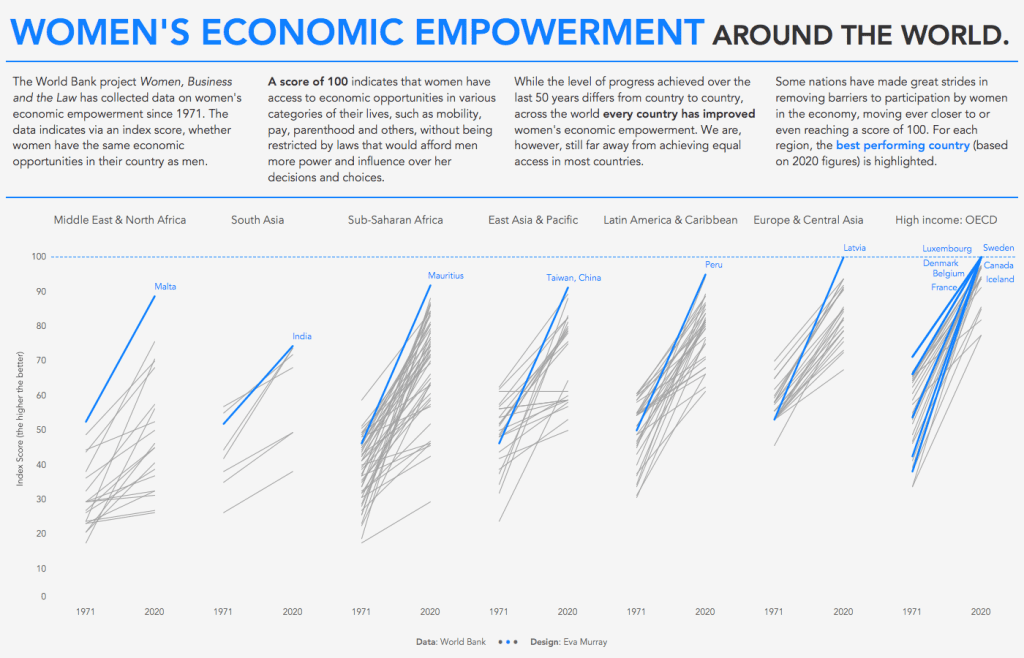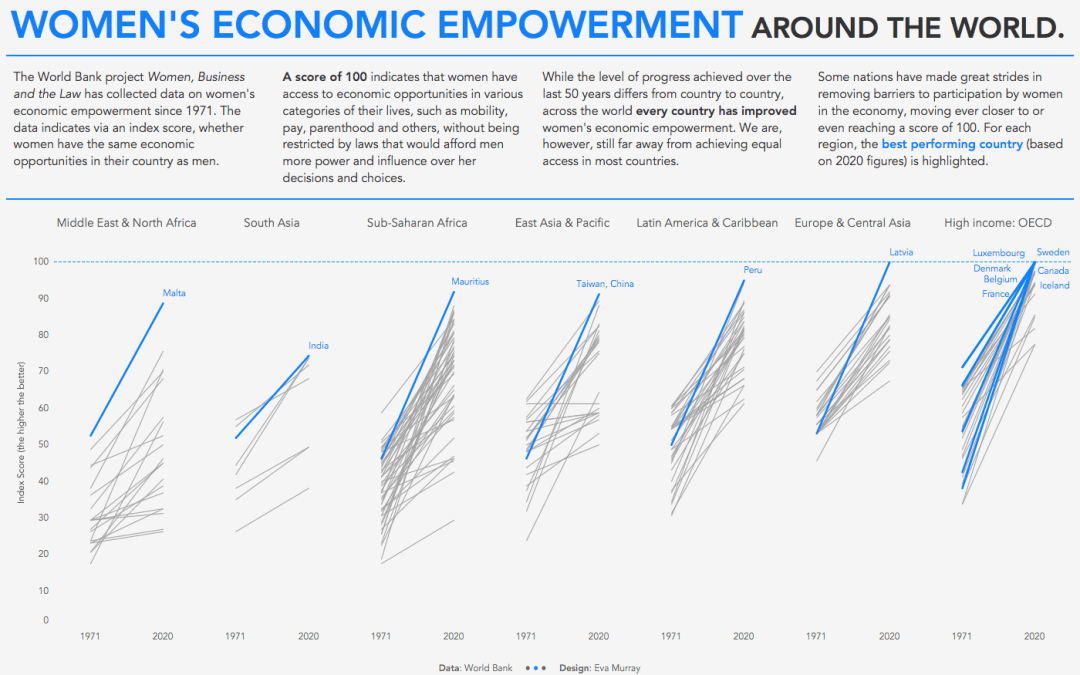 - What I like about this viz is that it is simple but it shows the overall progress that has happened in the last 50 decades. It also shows how far away many countries still are from the 100 points index, which indicates that women face now legal barriers to economic opportunities.