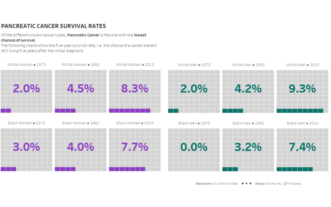 - I opted for a waffle chart (Thanks Andy for the tutorial) because it shows so clearly how few people survive beyond 5 years post diagnosis with pancreatic cancer