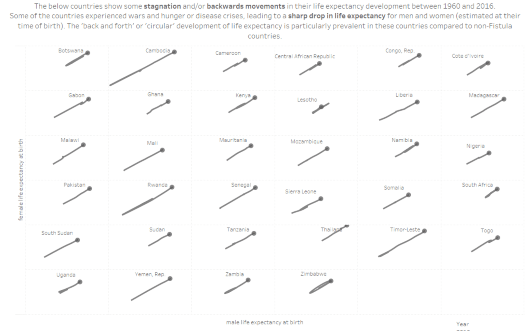 - Most of the countries with that pattern happen to also be ‘Fistula countries’, showing that where wars, famine and health crises had a strong negative impact on life expectancy between 1960-2016, there is also a higher prevalence of obstetric fistula