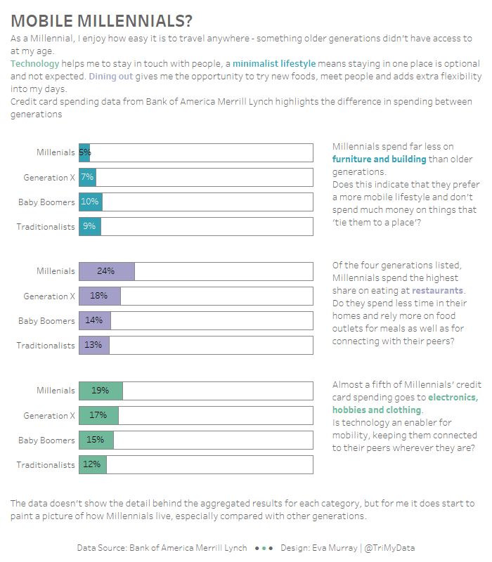• I decided to bring in my own opinion as the data reflects how I spend my money and I connected that to my lifestyle which is pretty mobile, being here there and everywhere, spending little on things and more on experiences.