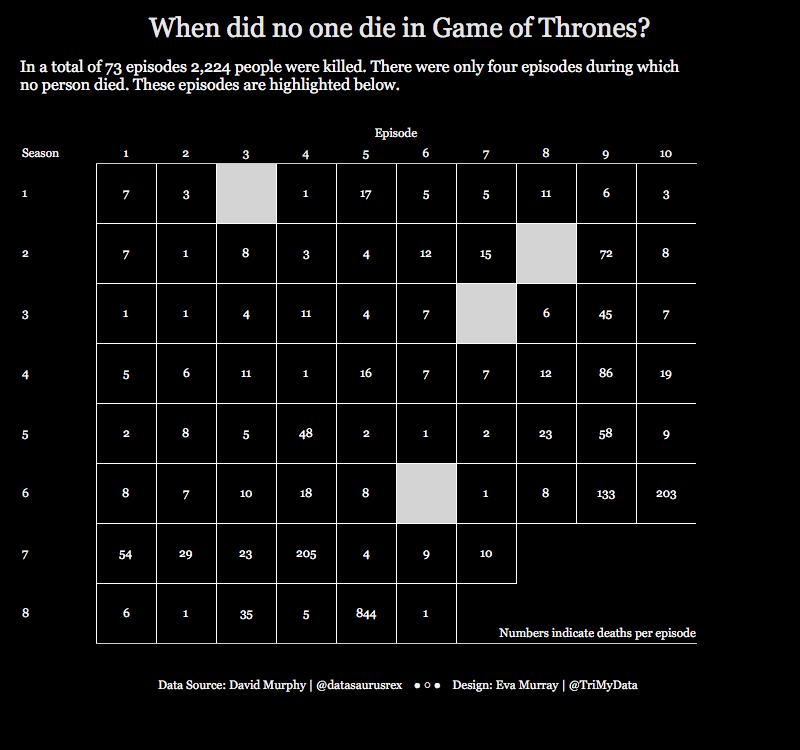 • Here is my viz about the episodes when no one died in Game of Thrones.