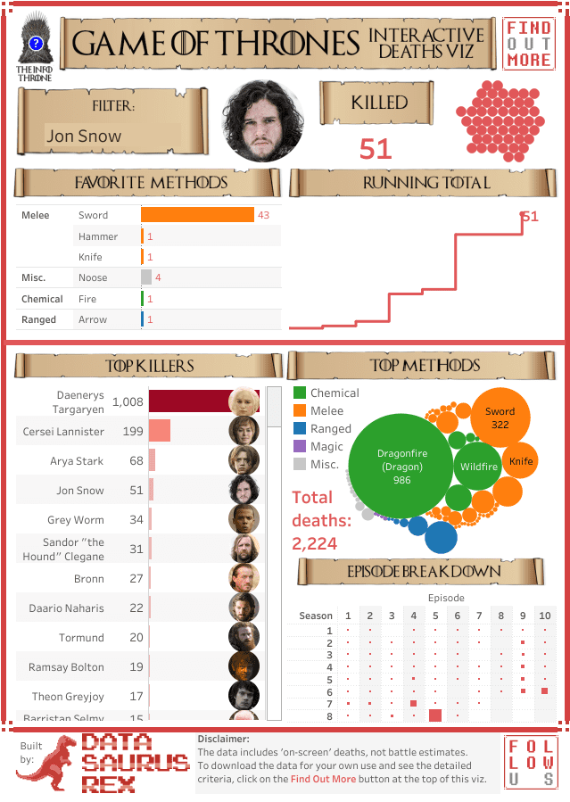 David Murphy, fellow Zen Master and actually my very first Tableau friend whom I met at a TUG in Sydney all the way back in 2013, didn’t just create a dashboard about GOT deaths but also collected all the data himself. That’s some serious dedication!