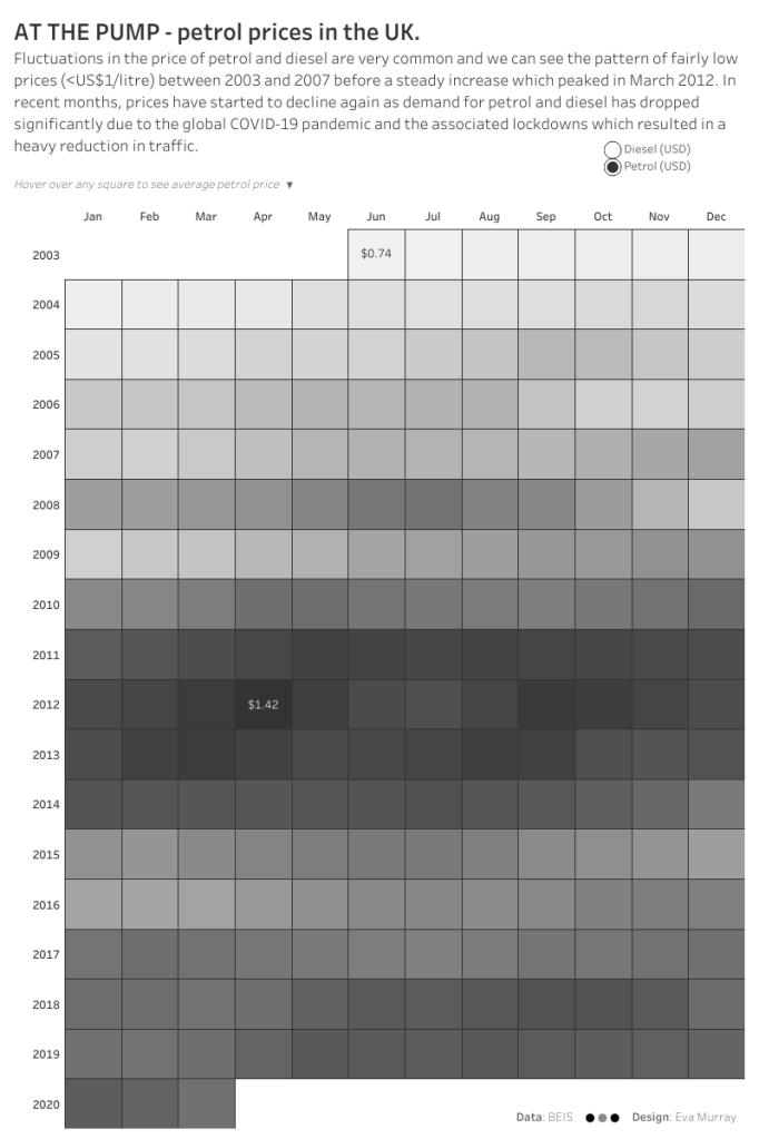 - A simple line chart covering 10 years worth of data and showing how petrol and diesel prices changes over time.