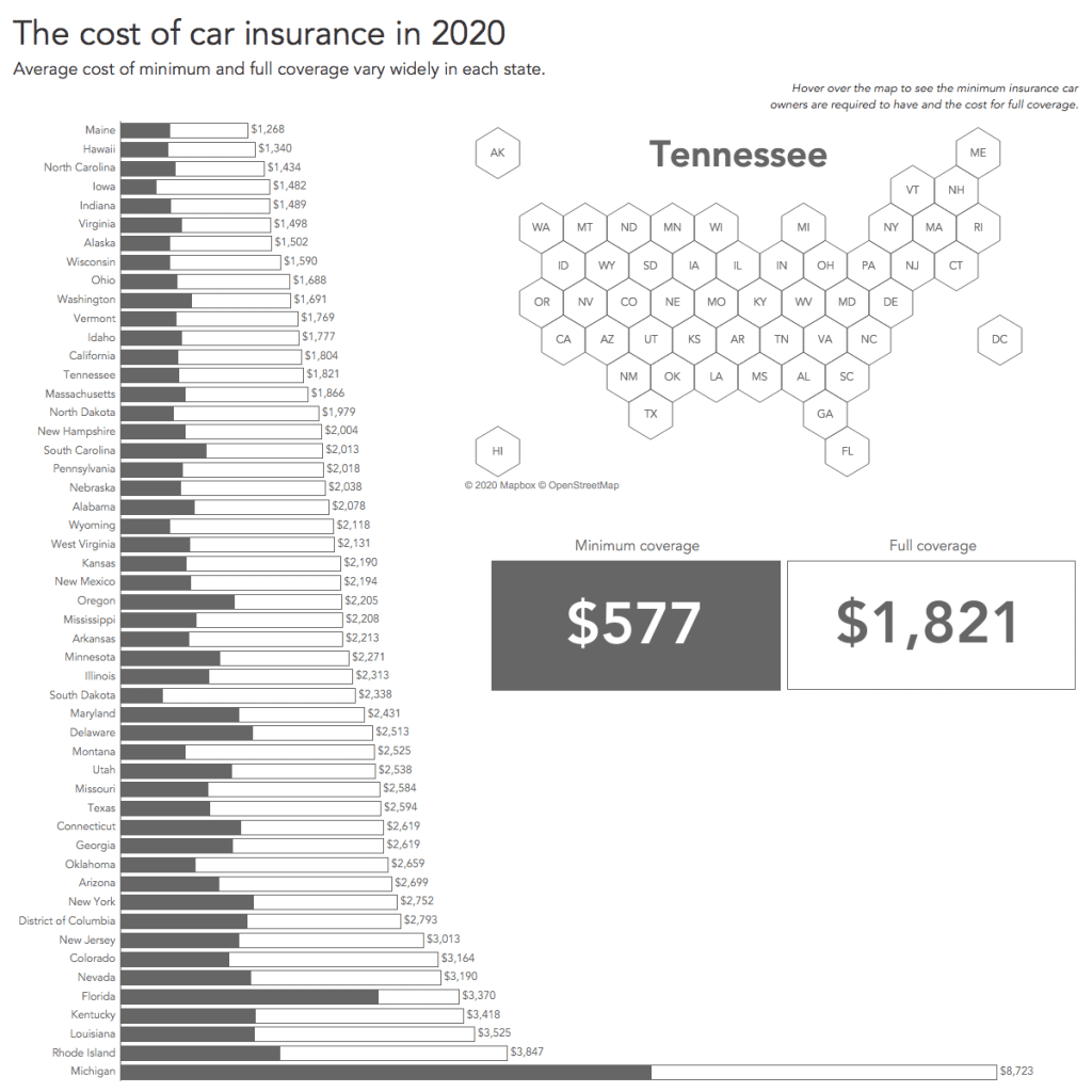For this week’s MakeoverMonday challenge we are looking at car insurance rates – the minimum and the maximum – for each US state. There are significant differences between the states and the visualization I found that aims to show these differences is in need of a makeover.